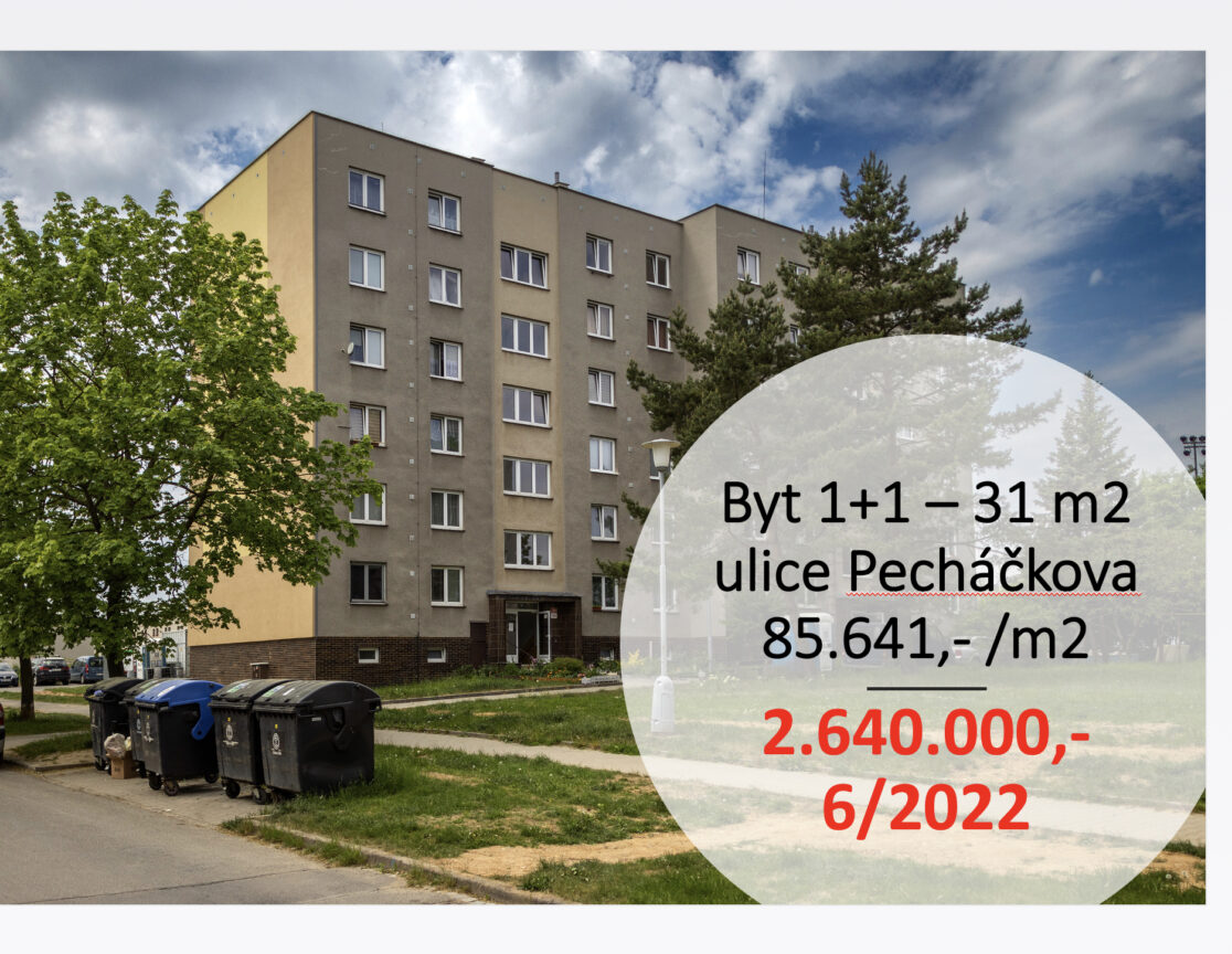Při prodej malých bytů 1kk, 1+1 bylo vždy dosaženo vyšší ceny za m2 plochy bytu. Ne jinak tomu bylo při prodeji bytu v Pecháčkově ulici. Cihlový byt k rekonstrukci se prodal v 6/2022 za 2.640.000,- Kč.