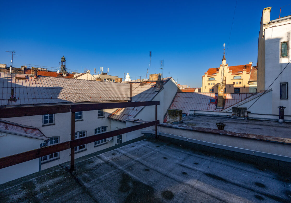 Činžovní dům má jeden podkrovní prostor o výměře cca 174 m2 a venkovní terasu nad zadním objektem, která by mohla do budoucna poskytnou další bytovou plochu – cca 50 m2.