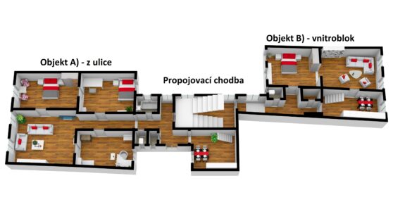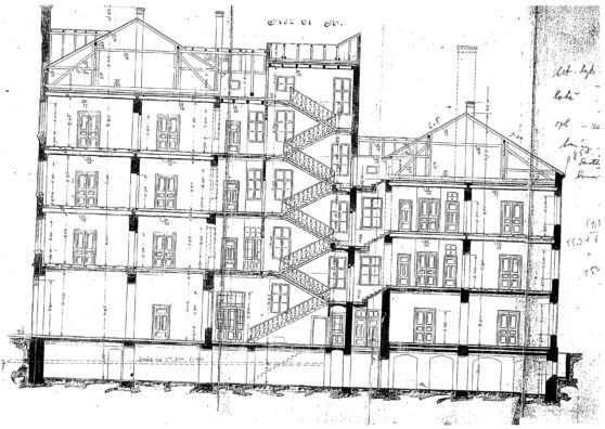 Tento dům s užitnou plochou více jak 1600 m2 je tvořen dvěma spojenými objekty s plně zastavenou parcelní plochou.